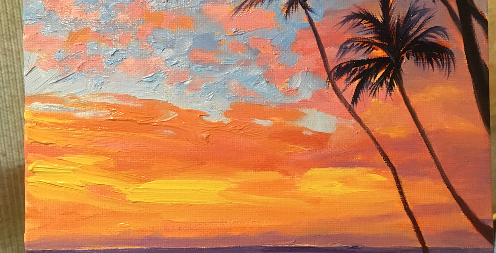 "Which one would you like me to paint?" I said. His reply: "You pick- surprise me". So I did. I picked the spot I painted in my piece "The 5 Palms Sunset" and could frequently visit for my on-site work. I used his photo as my reference for the sunset colors he captured. But I did not tell him this selection. It was going to be fabulous.
